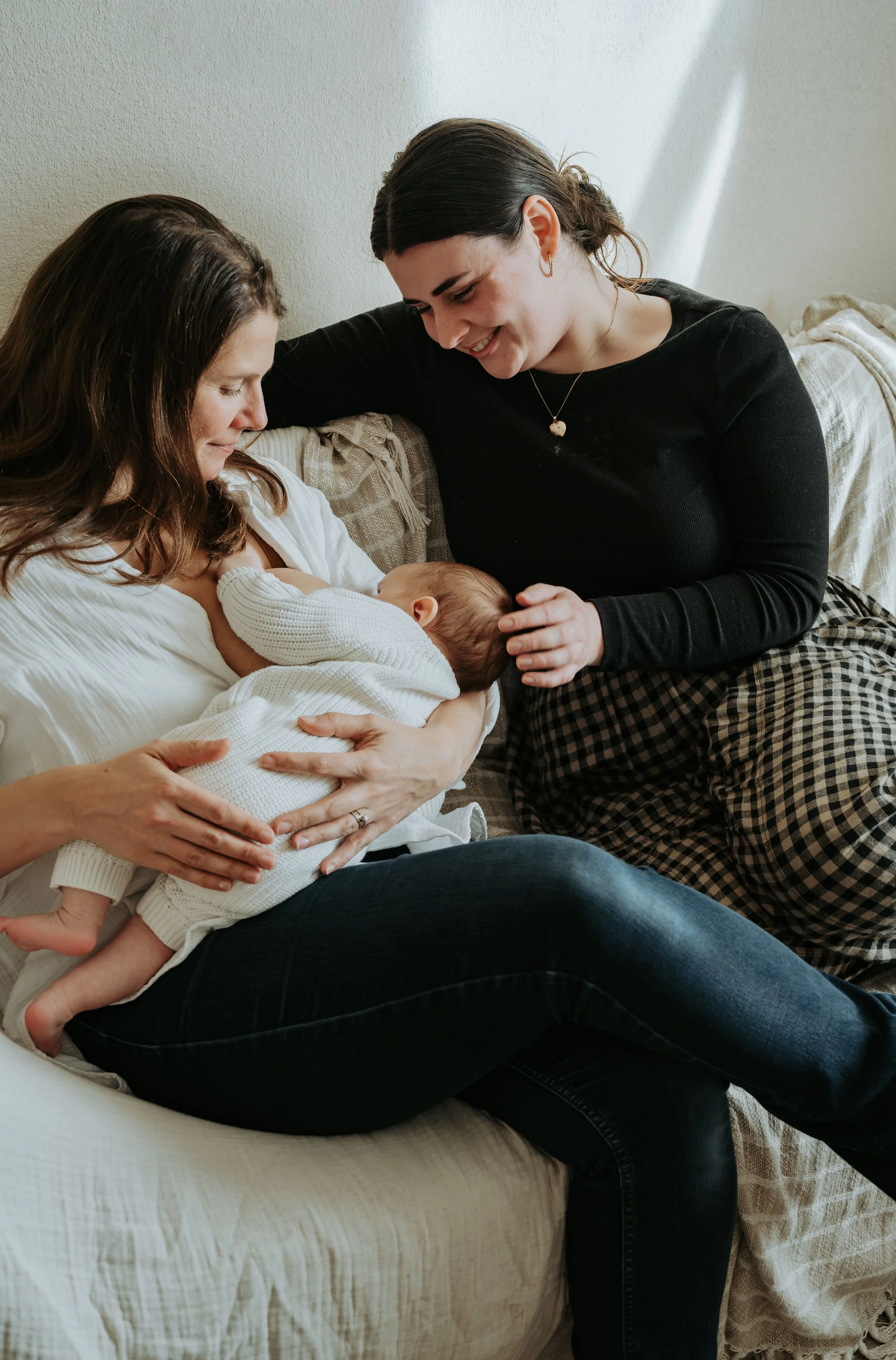 Feeding support (breast/formula), settling techniques, nappy care, bathing, baby-wearing basics and confidence-building.